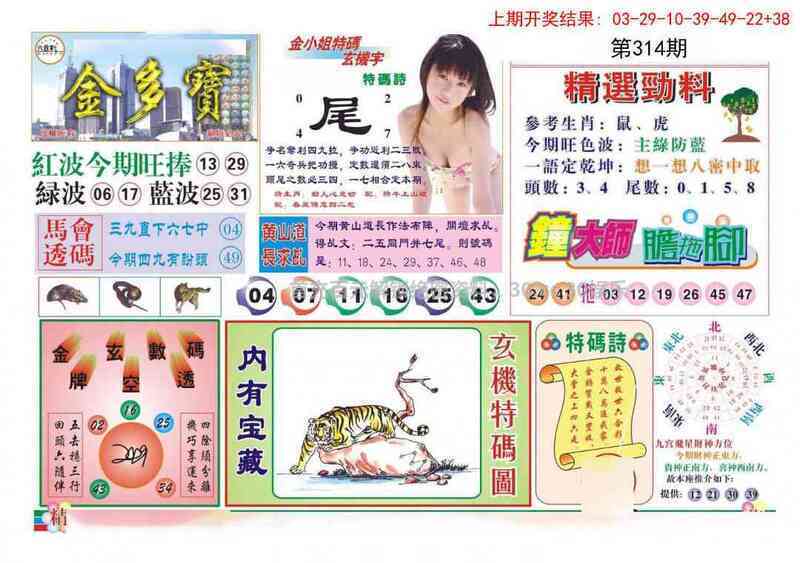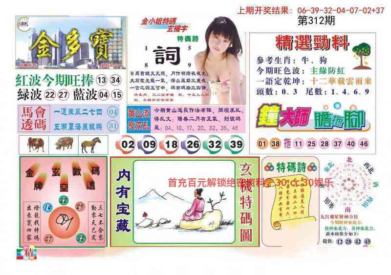 | 309期:金多宝 解:图中一语定乾坤可解心想事成的生肖,龙马蛇鸡鼠狗 综合:龙马蛇鸡鼠狗 防特:33.45.06.18.08.32 |