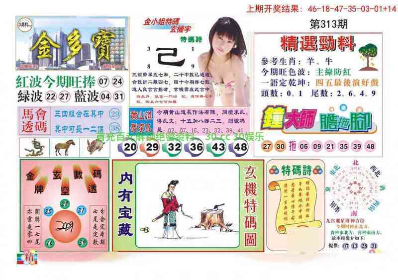 | 313期:金多宝 解:图中一语定乾坤可解吉星高照的生肖,鼠牛龙鸡兔狗 综合:鼠牛龙鸡兔狗 主特:06.18.05.29.26.38 |